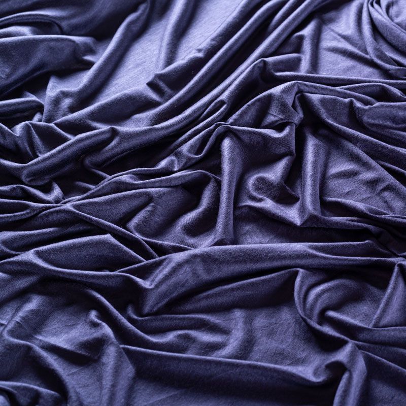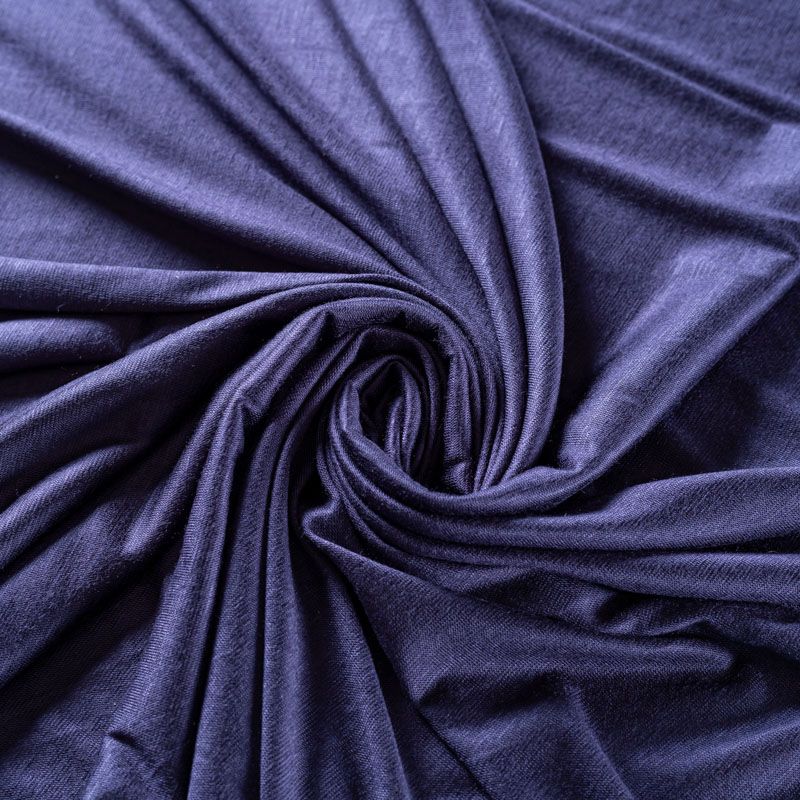 Тонкий хлопковый трикотаж темно-синего цвета с легким блеском на поверхности, который особенно эффектно смотрится в драпировке. Материал не просвечивает, приятный к телу и комфортный в носке. Подойдет для пошива топов, футболки, бадлонов, лонгслива, кардигана, спортивного платья.