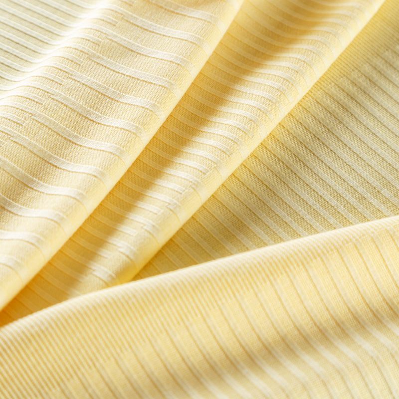 Трикотаж средней плотности, с высокой степенью эластичности, поверхность рельефная за счет эффекта резинки. С изнанки трикотаж гладкий, комфортный, подходит для использования без подклада. Сшить из такого полотна можно топы, лонгсливы, водолазки, платья,  юбки, брючные комплекты. Направление полос - вдоль линии кромки.