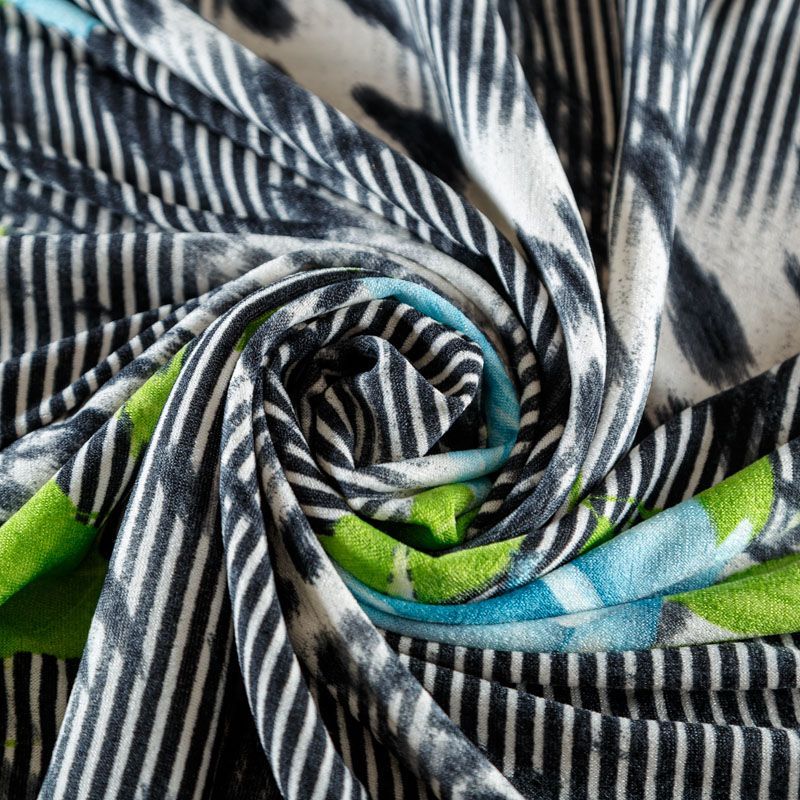 Трикотаж средней плотности, хорошо тянется за счет эластана в составе. Сочетание нескольких принтов образуют сложный цветочно-геометрический рисунок. Ткань не сухая, мягкая, не просвечивает, теплая, хорошо драпируется. Отлично подойдет для пошива платья, кардигана, свитшоша, лонгслива, мягкого жакета, юбки.