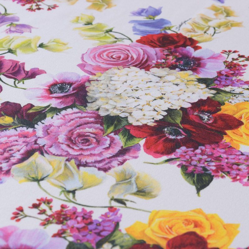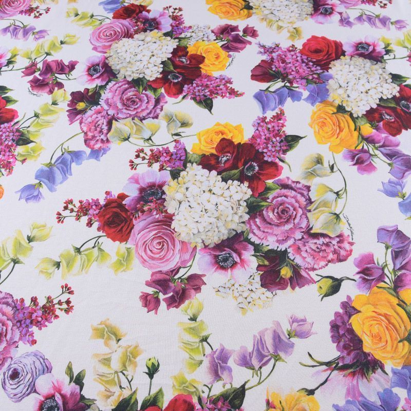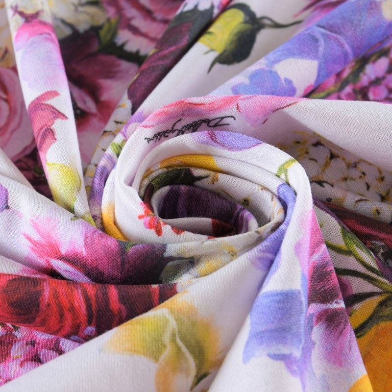 Итальянский брендовый трикотаж из хлопка с добавлением эластана белого цвета с ярким цветочным принтом. Полотно достаточно тонкое и легкое, слегка просвечивает. Материал мягкий, пластичный, хорошо растяжимый. Подойдет для пошива футболок, лонгслива, топов, спортивных платьев, домашней одежды.