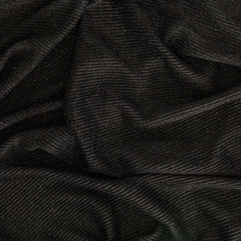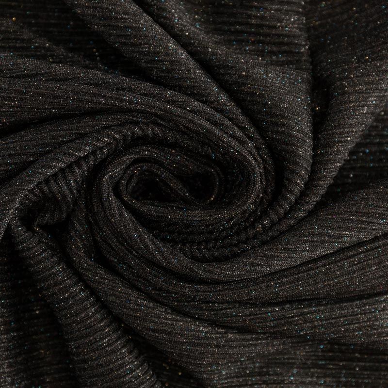 Легкая, слегка прозрачная ткань, с высокой степенью эластичности, поверхность рельефная за счет эффекта гофре и мерцающая за счет напыленного люрекса. Идеальна для облегающих изделий с использованием подклада, платья, топа, юбки, брюк, кардигана. Полоски гофре расположены поперек кромки, набирается объемом.
