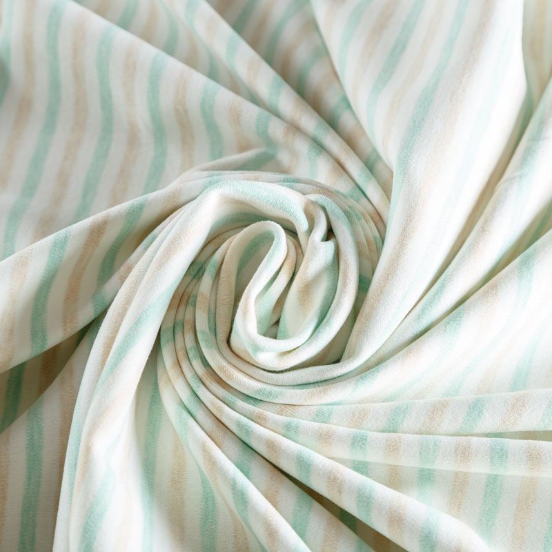 Хлопковый трикотаж качества пенье в полоску. Поверхность ткани гладкая, полотно средней плотности, не толстое, мягкое и нежное на ощупь, тянется за счет эластана в составе. Прерасно подойдет для пошива детской одежды, постельного белья и комплектов в кроватку, пижамы, домашней и летней одежды.