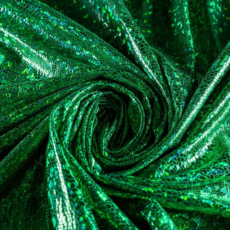 Эффектное трикотажное полотно с напыленными разноцветными блестками. Поверхность фактурная с рисунком под рептилию, который не деформируется при растяжении трикотажа. Материал очень пластичный, образует струящиеся мягкие складки, отлично тянется, не просвечивает, не мнется. Изнаночная сторона матовая, приятная на ощупь. Идеальный выбор для нарядных моделей, гимнастических и танцевальных костюмов.