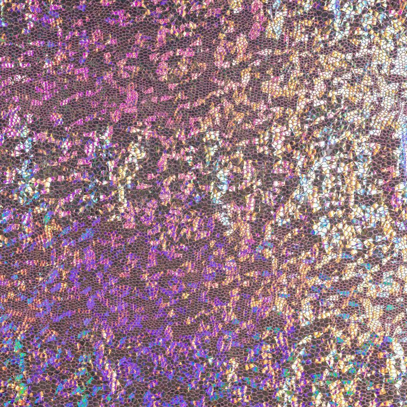 Эффектное трикотажное полотно с напыленными разноцветными блестками. Поверхность фактурная с рисунком под рептилию, который не деформируется при растяжении трикотажа. Материал очень пластичный, образует струящиеся мягкие складки, отлично тянется, не просвечивает, не мнется. Изнаночная сторона матовая, приятная на ощупь. Идеальный выбор для нарядных моделей, гимнастических и танцевальных костюмов.