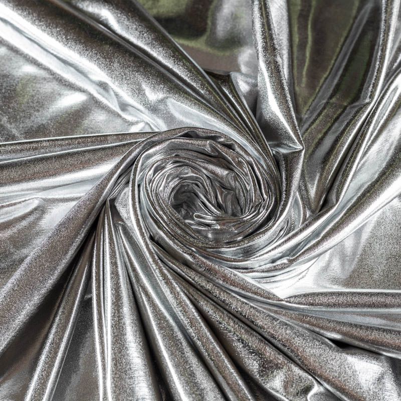 Эффектное трикотажное полотно с серебряным металлическим блеском. Материал очень пластичный, образует струящиеся мягкие складки, отлично тянется, не просвечивает, не мнется. Изнаночная сторона матовая, приятная на ощупь. Идеальный выбор для нарядных моделей, гимнастических и танцевальных костюмов.