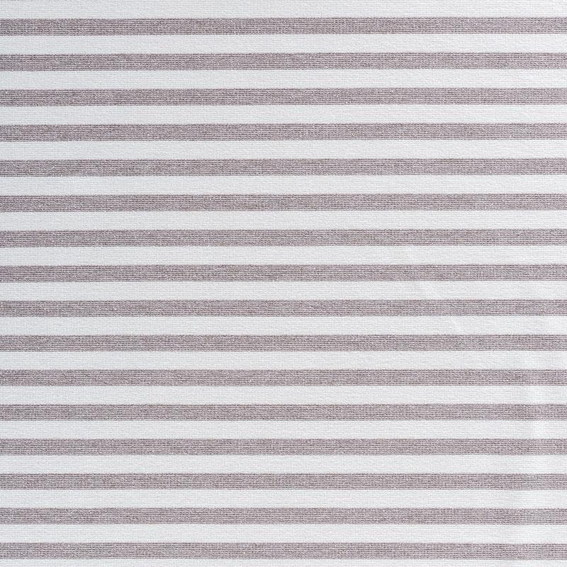Итальянский трикотаж "пенье" из вискозы в бежево-серую горизонтальную полоску с добавлением люрекса. Поверхность гладкая и матовая. Ткань очень плотная за счет плетения, пластичная, хорошо тянется, не просвечивает. Прекрасно подойдет для пошива лонгслива, футболки, кардигана, платья или юбки в спортивном стиле.