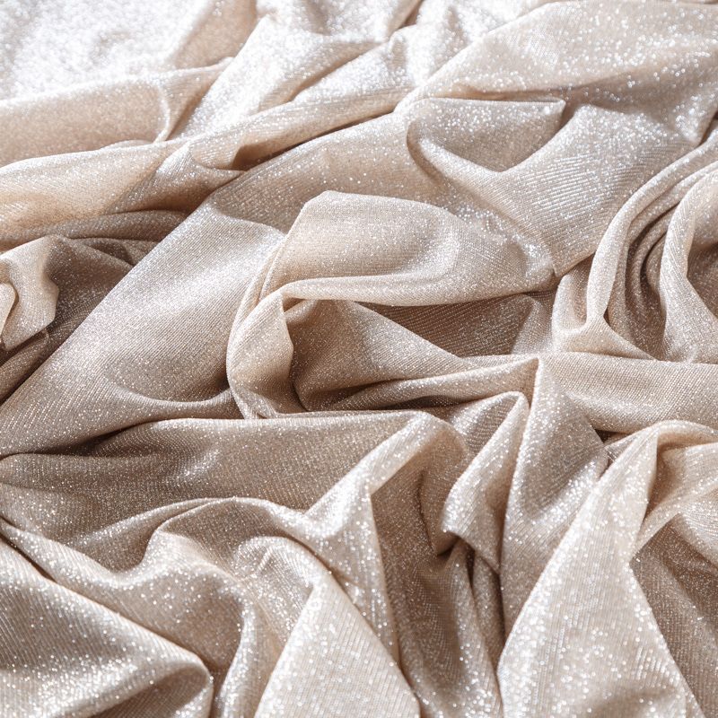 Тонкий и мягкий трикотаж золотистого оттенка с добавлением серебристой люрексной нити. Поверхность шероховатая на ощупь, трикотаж не рыхлый, пластичный, хорошо тянется, не просвечивает. Прекрасно подойдет для пошива лонгслива, гольфа, футболки, кардигана, платья или юбки в спортивном стиле.