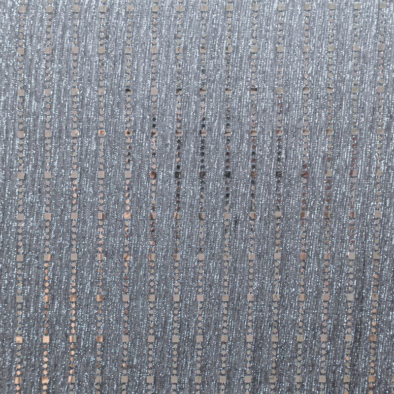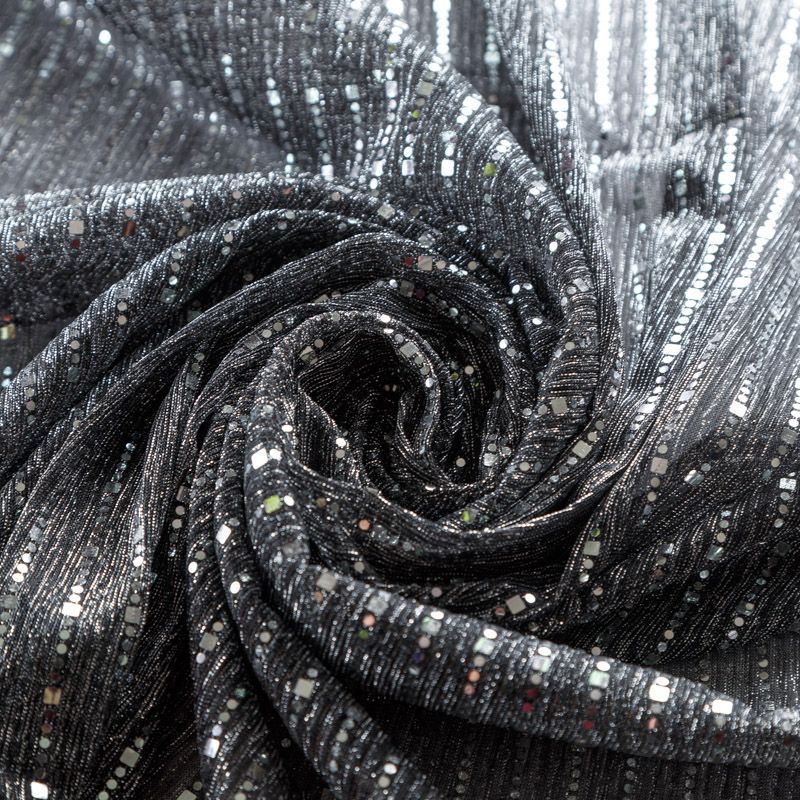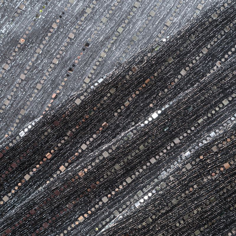 Мягкое и эффектное трикотажное полотно с люрексовой нитью металлизированными декоративными элементами. С лицевой стороны поверхность ткани  слегка шероховатая на ощупь, с изнанки трикотаж гладкий, комфортный. Отлично пододет для пошива водолазки, платья, топа, спортивных купальников, нарядных изделий.