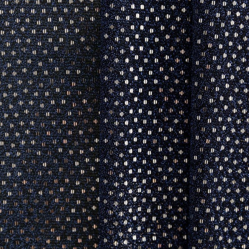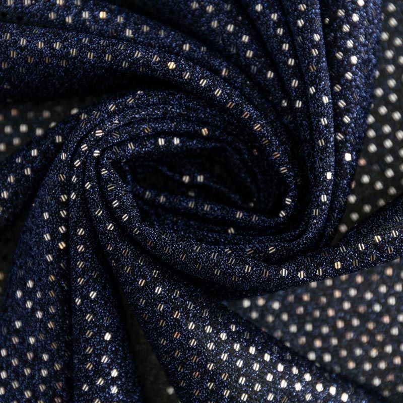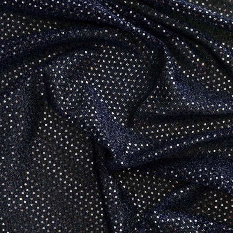Трикотаж глубокого сапфирового цвета с синей люрексовой нитью и мелкими серебристыми пайетками. Мягкая и эластичная ткань, великолепно драпируется и красиво облегает. Тонкий, просвечивает, требуется подклад. Прекрасно подходит для изделий по фигуре, а также нарядов с мягкими складками. Трикотаж можно использовать для вечерних образов — платья, блузки, топы, кофточки и боди и для пошива танцевальных и сценических костюмов.