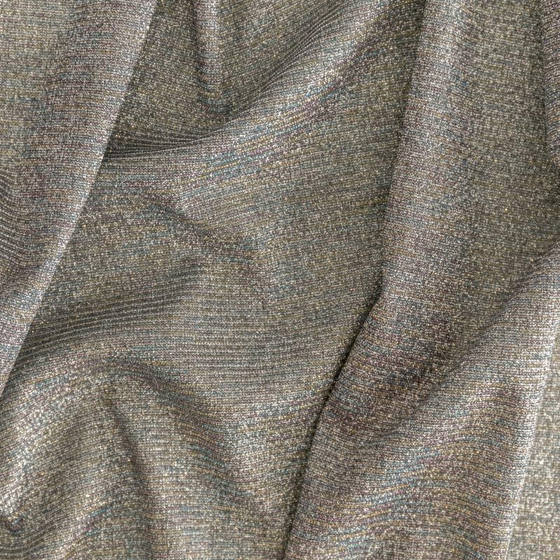 Мягкое и эффектное трикотажное полотно с металлизированным напылением. Структура полотна плотная, легко растяжимая, эластичная. С лицевой стороны поверхность ткани  слегка шероховатая на ощупь, характеризуется заметным блеском «металлик». С изнанки трикотаж гладкий, комфортный, подходит для использования без подклада. Отлично пододет для пошива водолазки, платья, топа, леггинсов, спортивных купальников, нарядных изделий.