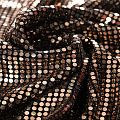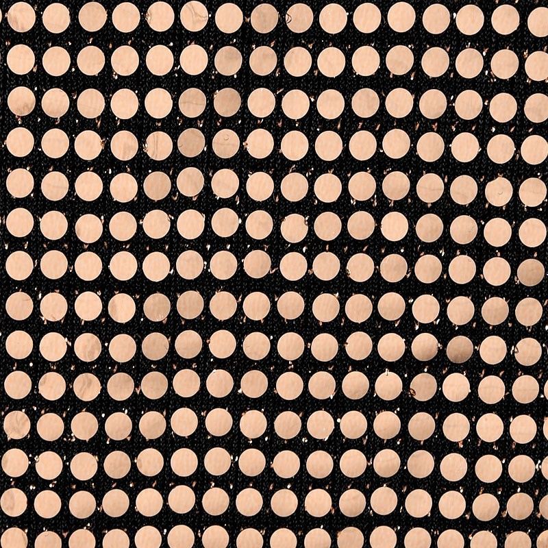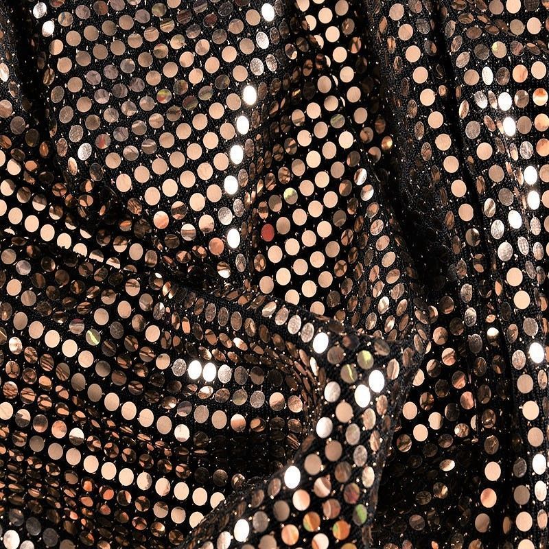 Трикотажное черное полотно с блестящими зеркальными золотистыми круглыми пайетками. Декор накатан на основу, поэтому будет комфортен в носке. Ткань пластичная, прекрасно драпируется и укладывается в складки, легко садится по фигуре за счёт основы с эластаном, не прозрачная, позволит шить изделия без подклада. Идеально подойдет для пошива нарядных вечерних образов: платья, юбки, топа, туники, широких брюк, жакета, кардигана.