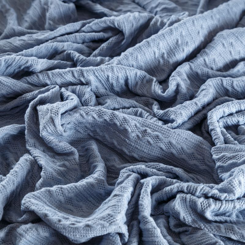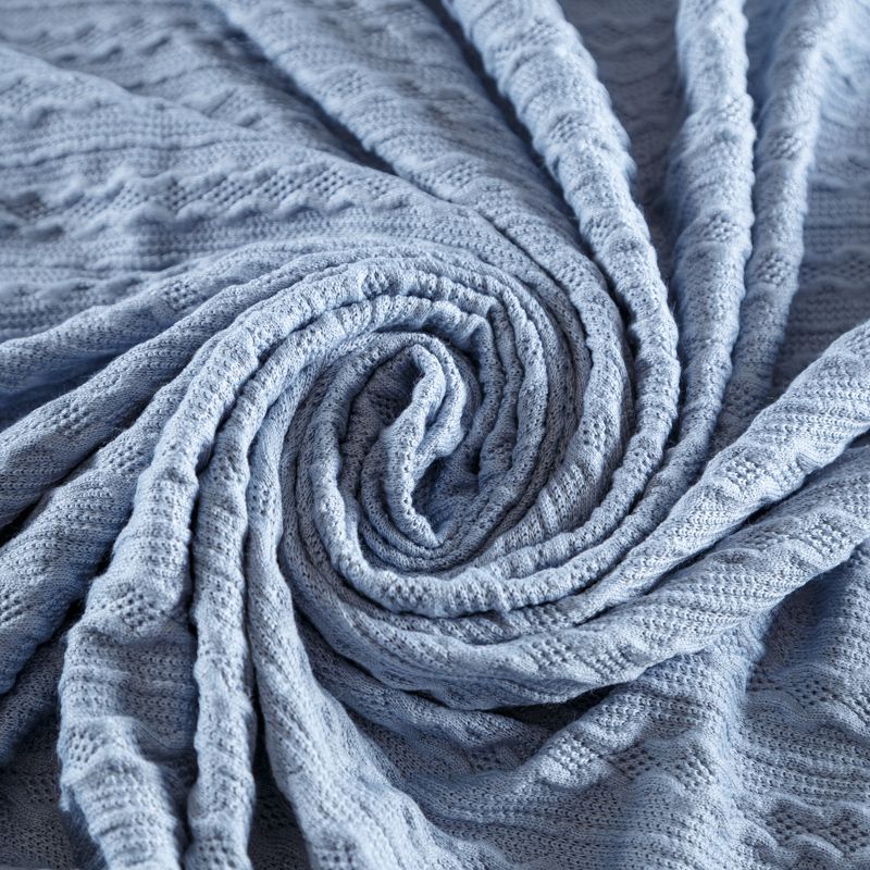 Текстурное вязаное, мягкое, пластичное полотно средней плотности в голубом оттенке. Вязаный узор - стилизованая косичка с полосками расположен по всему полотну. Подойдет для пошива уютного свитера, кардигана, юбки, платья, водолазок, снудов и головных уборов.