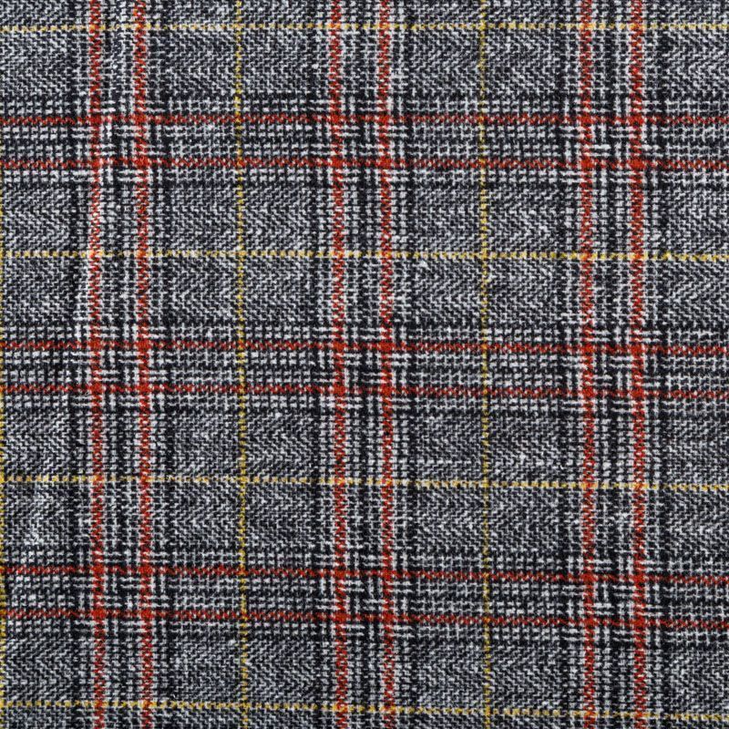Фактурная и плотная твидовая ткань с добавлением хлопка в красивую и сложную черно-белую клетку, которую освежают тонкие полоски кирпичного и желтого оттенков. Ткань мягкая, пластичная, приятная на ощупь. Хорошо драпируется и образует формоустойчивые складки. Твид отлично подходит для пошива костюмов, пальто, пиджаков, брюк и курток, юбок, жилетов, головных уборов в классическом стиле.