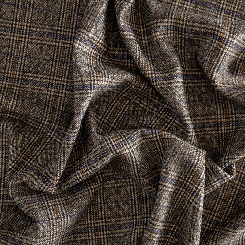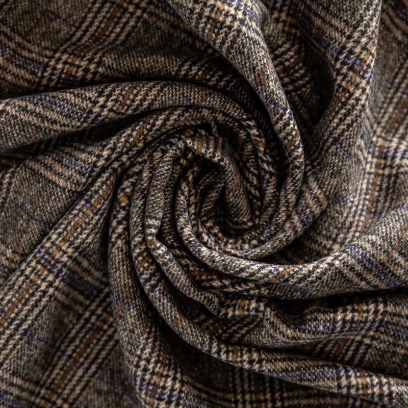 Фактурная и плотная твидовая ткань с добавлением натуральной шерсть в красивую и сложную клетку тартан. Материал саржевого переплетения, слегка шероховатый на ощупь. Хорошо драпируется и образует формоустойчивые складки. Ткань отлично подходит для пошива костюмов, пальто, пиджаков, брюк и курток, юбок, жилетов, головных уборов в классическом стиле.