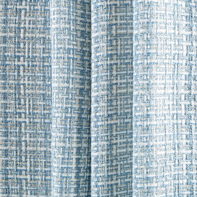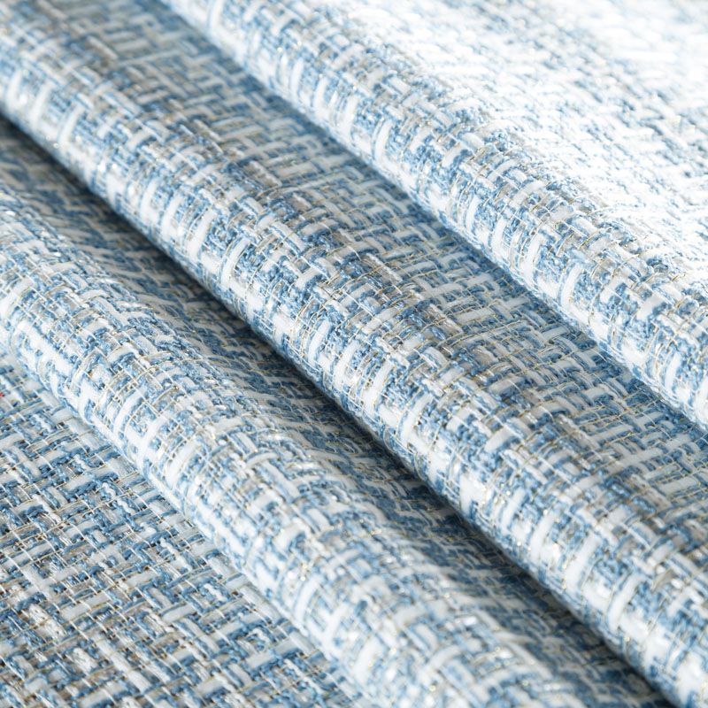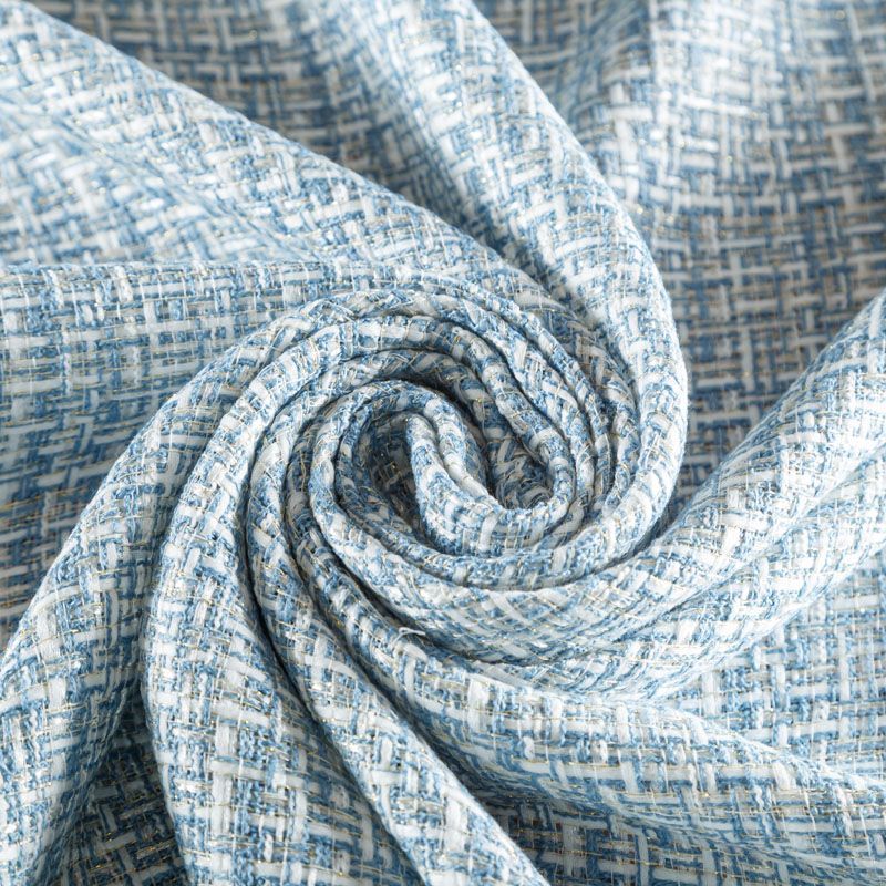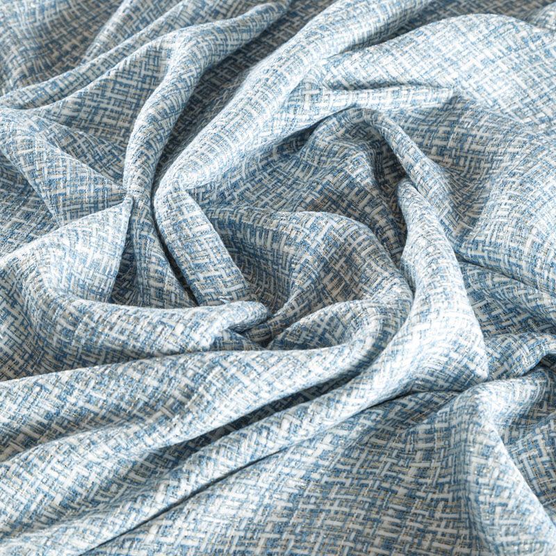 Отличительная особенность этой ткани в полотняном плетении нитей, характерного для рогожки, олицетворяющая сложную "клетчатую" геометрию в бело-голубых оттенках. Различная толщина нитей создает эффектную фактуру. Ткань достаточно формоустойчивая, при этом пластичная, гибкая за счет плетения,  матовая, мягкая, приятная на ощупь, не рыхлая. Прекрасно подойдет для пошива жакета, юбки в виде трапеции, легкого пальто, костюма.