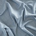 Отличительная особенность этой ткани в полотняном плетении нитей, характерного для рогожки, олицетворяющая сложную "клетчатую" геометрию в нежных голубых оттенках. Различная толщина нитей создает эффектную фактуру. Ткань достаточно формоустойчивая, при этом пластичная, гибкая за счет плетения, матовая, мягкая, приятная на ощупь, не рыхлая. Прекрасно подойдет для пошива жакета, юбки в виде трапеции, легкого пальто, костюма.