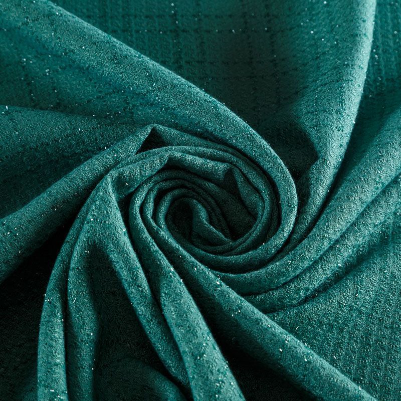 Твид средней плотности с рельефной поверхностью зеленого оттенка с добавлением акцента в виде люрексовой нити, которая имитирует клетку и добавляет ткани нарядности. Твид пластичный, хорошо драпируется, умеренно держит форму, прекрасно подойдет для пошива жакетов на подкладе, жилетов, кардиганов, легких пальто, юбок и платьев.