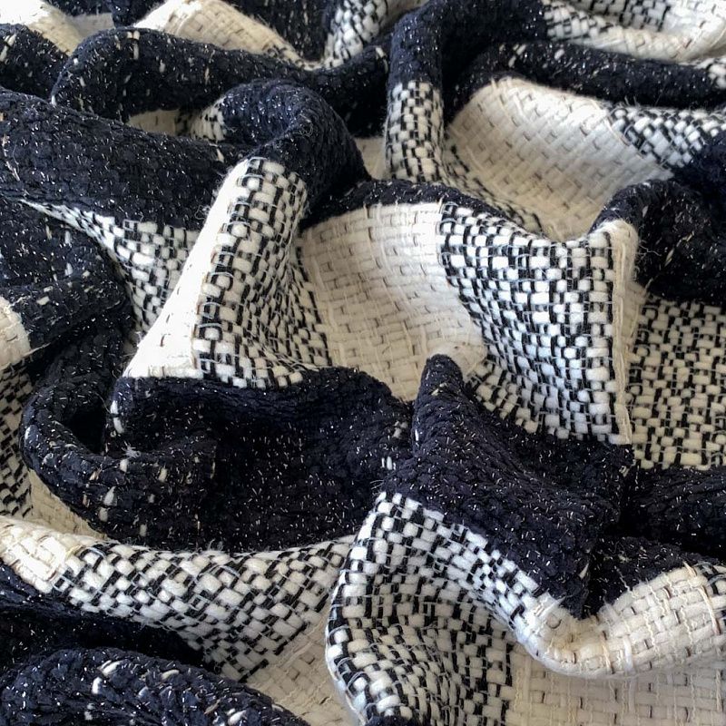 Твид молочного оттенка в крупную синюю клетку, украшенную серебряным люрексом. Ткань не толстая, мягкая, теплая и уютная, хорошо драпируется. Фактура с многочисленными узелками, очень приятная на ощупь. Можно использовать для пошива изделий классического кроя - юбки, жакеты, костюмы или пальто.
