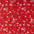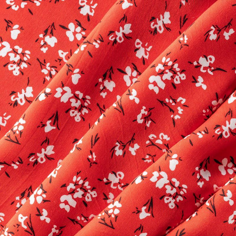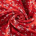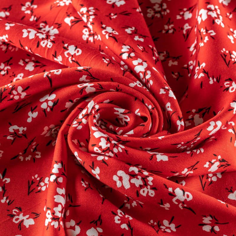 Мягкая ткань средней плотности, имеет саржевое плетение и характерный диагональный рубчик на поверхности. Хорошо сохраняет форму, не сильно мнется и не деформируется в процессе эксплуатации.  Красиво ложится в складки, поэтому прекрасно подойдет на длинные драпированные юбки и платья, на свободные брюки или шорты, топы. Качественный твил-штапель с нежным принтом из мелких цветочков на ярком красном фоне.