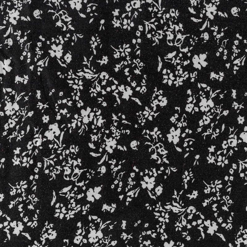 Качественный вискозный твил-штапель с нежным принтом из мелких букетиков на контрастном черном фоне. Мягкая ткань средней плотности, имеет саржевое плетение и характерный диагональный рубчик на поверхности. Хорошо сохраняет форму, не сильно мнется и не деформируется в процессе эксплуатации. Красиво ложится в складки, поэтому прекрасно подойдет на длинные драпированные юбки и платья, туники, на свободные брюки или шорты, топы.