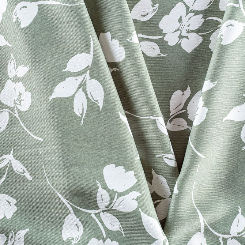 Качественный твил-штапель с белым цветочным принтом на фисташковом фоне. Мягкая ткань средней плотности, имеет саржевое плетение и характерный диагональный рубчик на поверхности. Хорошо сохраняет форму, не сильно мнется и не деформируется в процессе эксплуатации. Красиво ложится в складки, поэтому прекрасно подойдет на длинные драпированные юбки и платья, на свободные брюки или шорты, топы.