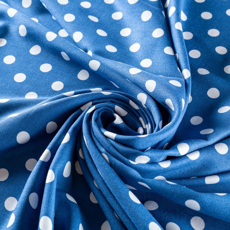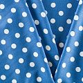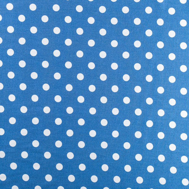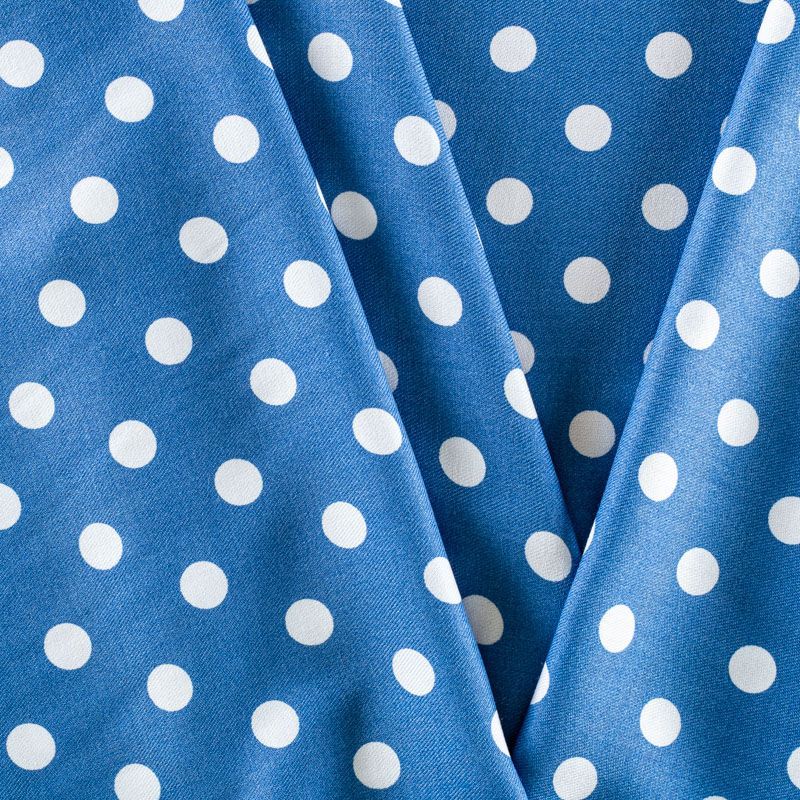 Качественный твил-штапель с белым горохом на голубом фоне. Мягкая ткань средней плотности, имеет саржевое плетение и характерный диагональный рубчик на поверхности. Хорошо сохраняет форму, не сильно мнется и не деформируется в процессе эксплуатации.  Красиво ложится в складки, поэтому прекрасно подойдет на длинные драпированные юбки и платья, на свободные брюки или шорты, топы.