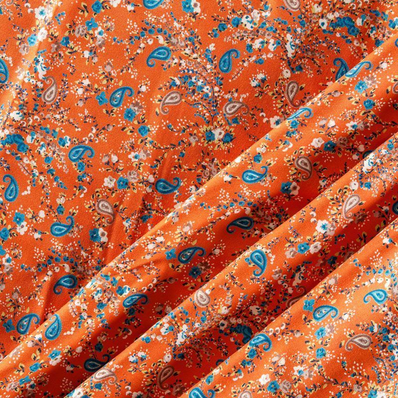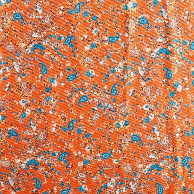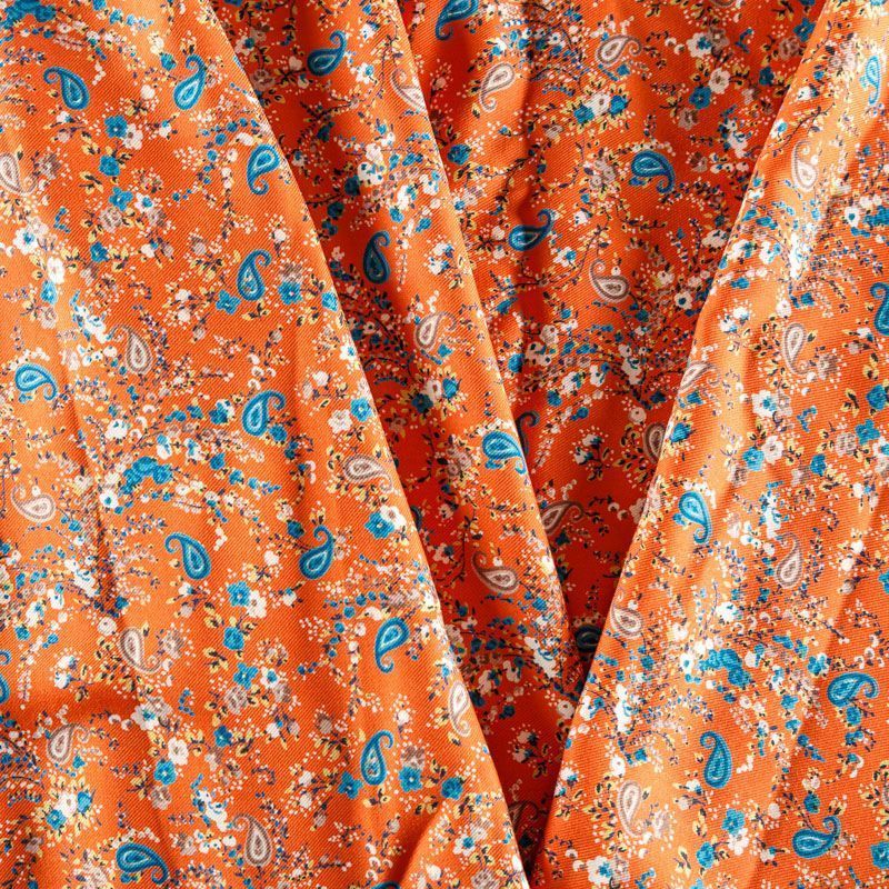 Плотная и мягкая ткань приглушенного оранжевого оттенка с ярким мелкоцветом, имеет саржевое плетение и характерный диагональный рубчик на поверхности. Отлично сохраняет форму, не сильно мнется и не деформируется в процессе эксплуатации. Красиво ложится в складки, поэтому прекрасно подойдет на длинные драпированные юбки и платья, на свободные брюки или шорты, топы.