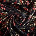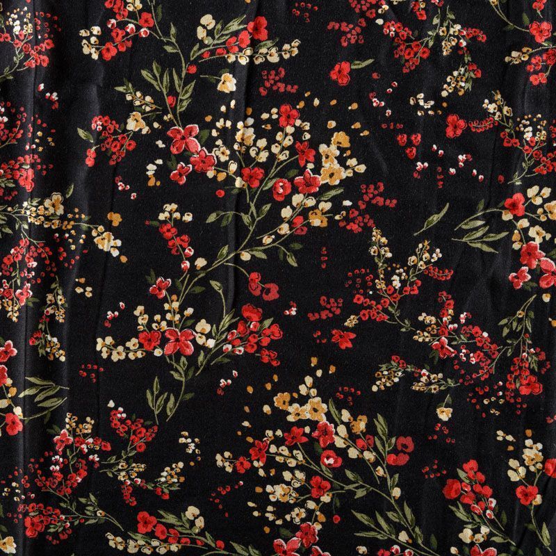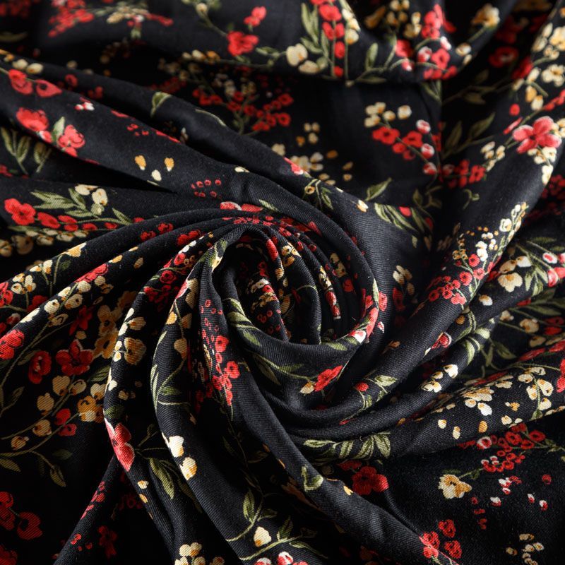 Плотная и мягкая ткань черного цвета с ярким мелкоцветом, имеет саржевое плетение и характерный диагональный рубчик на поверхности. Отлично сохраняет форму, не сильно мнется и не деформируется в процессе эксплуатации. Красиво ложится в складки, поэтому прекрасно подойдет на длинные драпированные юбки и платья, на свободные брюки или шорты, топы.