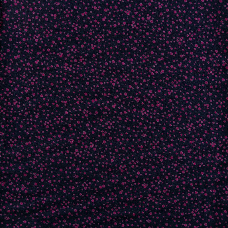 Плотная и мягкая ткань фиолетово-синего оттенка с хаотичным мелким принтом цвета фуксии, имеет саржевое плетение и характерный диагональный рубчик на поверхности. Отлично сохраняет форму, не сильно мнется и не деформируется в процессе эксплуатации. Красиво ложится в складки, поэтому прекрасно подойдет на длинные драпированные юбки и платья, на свободные брюки или шорты, топы.