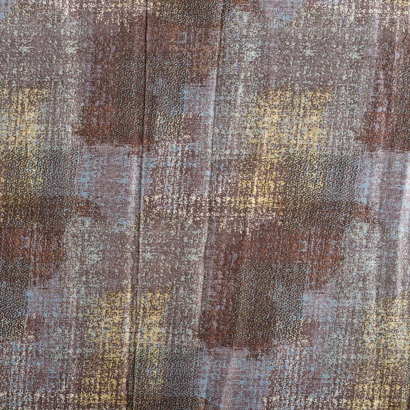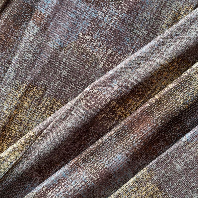 Плотная и мягкая ткань серо-голубого оттенка с абстрактным принтом, имеет саржевое плетение и характерный диагональный рубчик на поверхности. Отлично сохраняет форму, не сильно мнется и не деформируется в процессе эксплуатации. Красиво ложится в складки, поэтому прекрасно подойдет на длинные драпированные юбки и платья, на свободные брюки или шорты, топы.