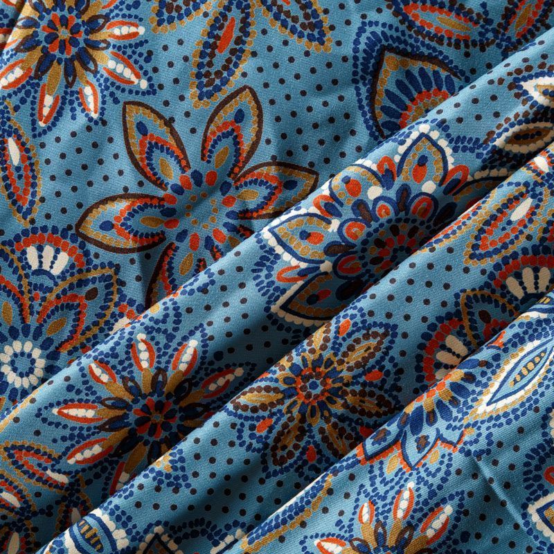 Плотная и мягкая ткань голубого оттенка со стилизованным цветочным орнаментом, имеет саржевое плетение и характерный диагональный рубчик на поверхности. Отлично сохраняет форму, не сильно мнется и не деформируется в процессе эксплуатации. Красиво ложится в складки, поэтому прекрасно подойдет на длинные драпированные юбки и платья, на свободные брюки или шорты, топы.