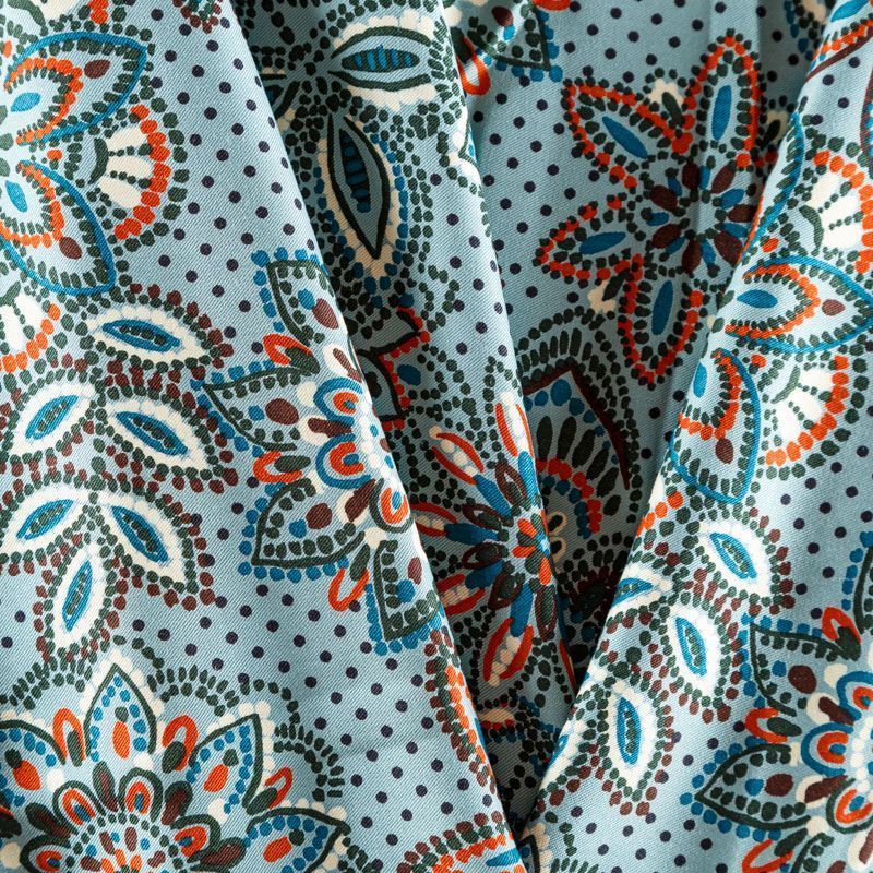 Плотная и мягкая ткань мятно-зеленого оттенка со стилизованным цветочным орнаментом, имеет саржевое плетение и характерный диагональный рубчик на поверхности. Отлично сохраняет форму, не сильно мнется и не деформируется в процессе эксплуатации.  Красиво ложится в складки, поэтому прекрасно подойдет на длинные драпированные юбки и платья, на свободные брюки или шорты, топы.