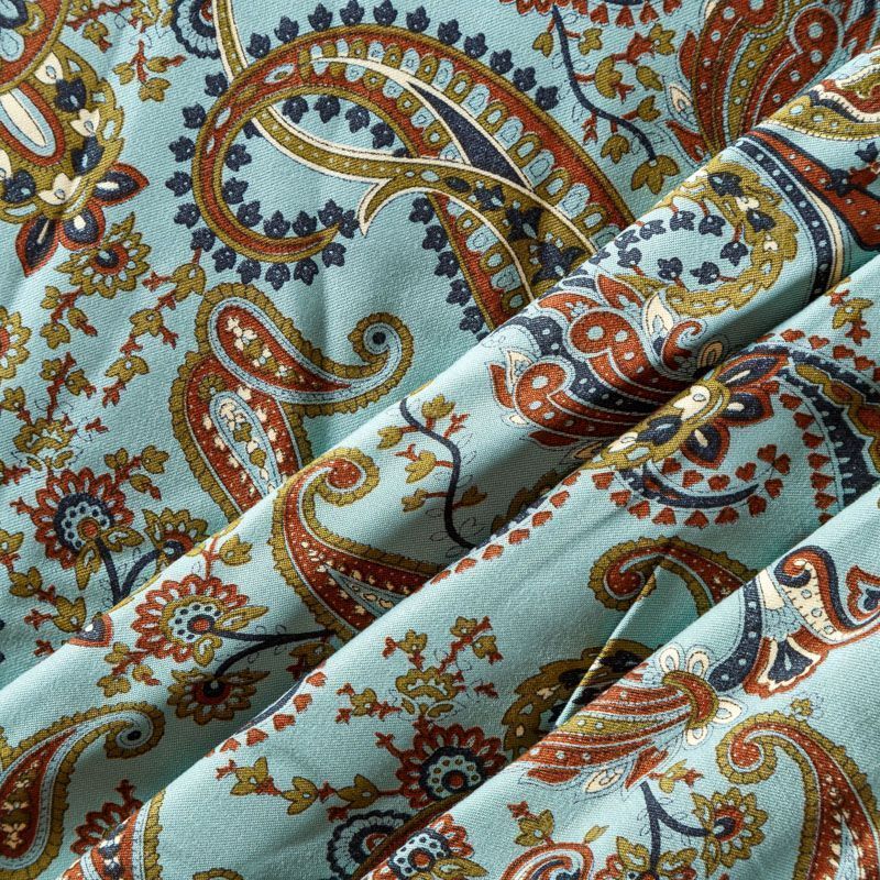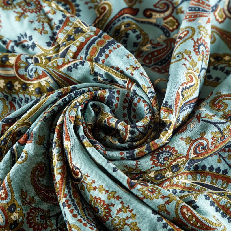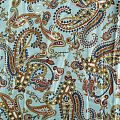 Плотная и мягкая ткань зеленого оттенка с оливково-коричневым узором пейсли, имеет саржевое плетение и характерный диагональный рубчик на поверхности. Отлично сохраняет форму, не сильно мнется и не деформируется в процессе эксплуатации. Красиво ложится в складки, поэтому прекрасно подойдет на длинные драпированные юбки и платья, на свободные брюки или шорты, топы.