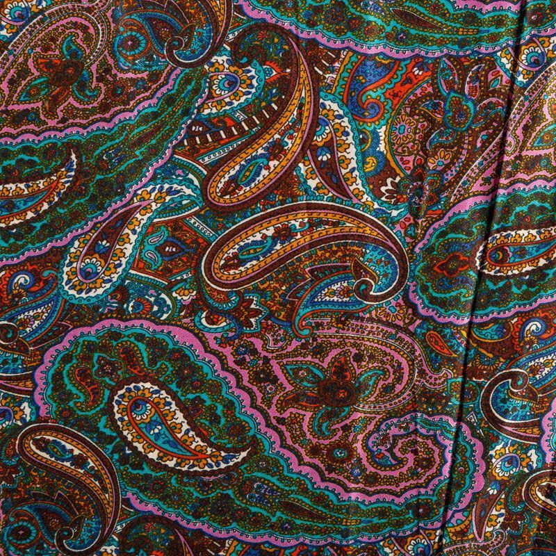 Плотная и мягкая ткань сливового оттенка с богатым узором пейсли, имеет саржевое плетение и характерный диагональный рубчик на поверхности. Отлично сохраняет форму, не сильно мнется и не деформируется в процессе эксплуатации. Красиво ложится в складки, поэтому прекрасно подойдет на длинные драпированные юбки и платья, на свободные брюки или шорты, топы, комбинезоны, а также для домашней одежды.