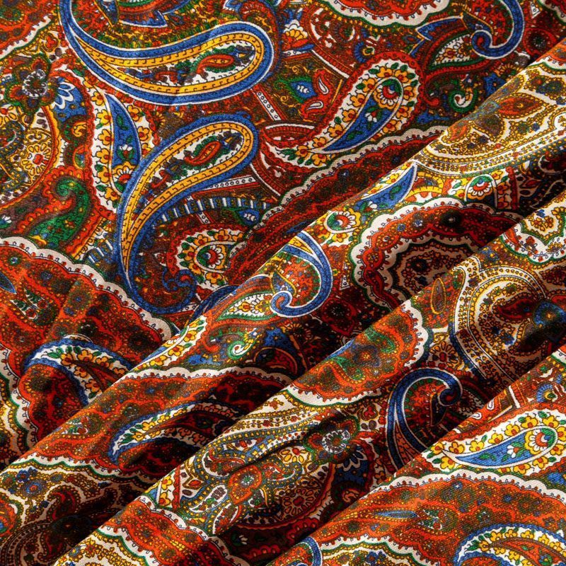 Плотная и мягкая ткань бежевого оттенка с богатым узором пейсли в желто-коричневых тонах, имеет саржевое плетение и характерный диагональный рубчик на поверхности. Отлично сохраняет форму, не сильно мнется и не деформируется в процессе эксплуатации. Красиво ложится в складки, поэтому прекрасно подойдет на длинные драпированные юбки и платья, на свободные брюки или шорты, топы, комбинезоны, а также для домашней одежды.
