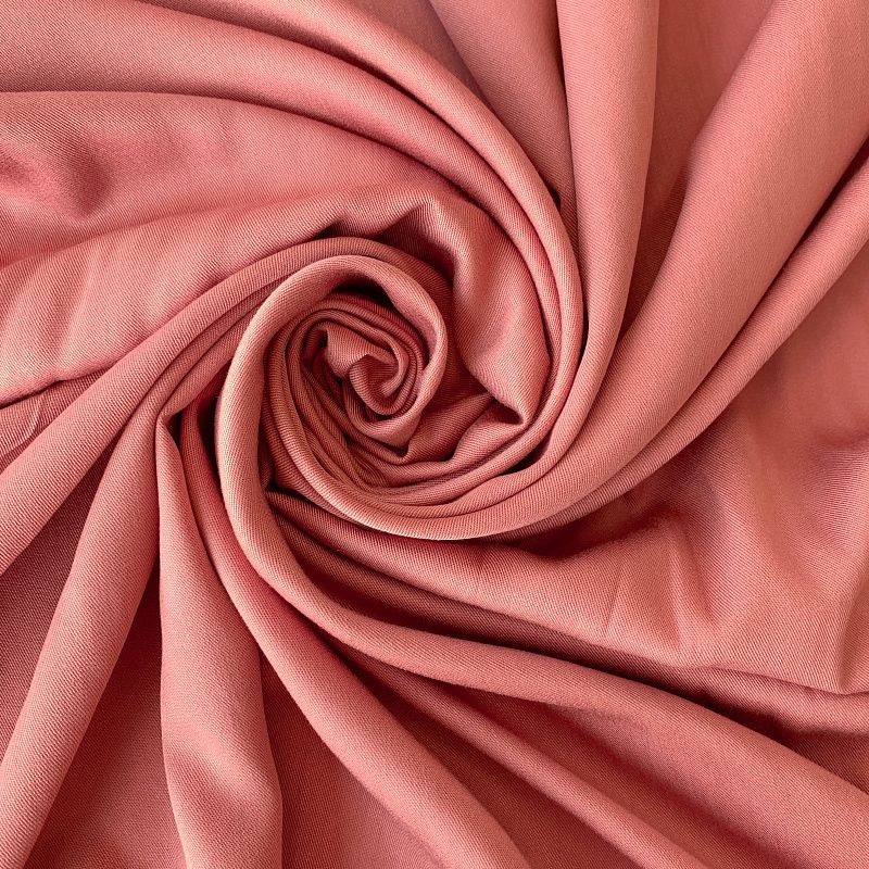 Плотная и мягкая ткань, имеет саржеве плетение и характерный диагональный рубчик на поверхности. Отлично сохраняет форму, не сильно мнется и не деформируется в процессе эксплуатации. Красиво ложиться в складки, поэтому прекрасно подойдет на длинные драпированные юбки и платья, на свободные брюки или шорты, топы.