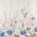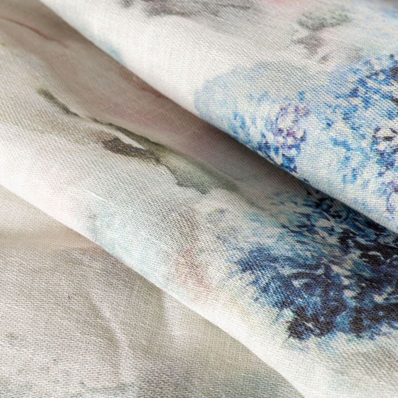 Ткань изготовлена изо льна методом полотняного переплетения. Она прочная, достаточно плотная, держит форму и обладает ярко выраженной фактурой. Эта ткань подойдет для пошива штор, римских штор, предметов столового белья. Её можно использовать для декора интерьера загородного дома или веранды. На расстоянии 1 м от низа тюля расположен принтованный акварельный рисунок в сине-розовых оттенках.