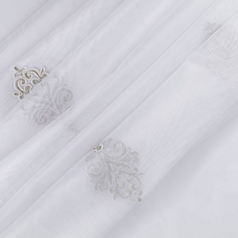 Сетка с вышивкой – это роскошный элемент дизайна, который преобразит любое помещение. Она отлично пропускает воздух, поэтому быстро сохнет после стирки. Прочная, ткань прослужит долго. Выдерживает большое количество стирок. Легкая, фактура ткани практически невесома, поэтому можно не опасаясь крепить ее даже на самый тонкий карниз. Сутажная элегантная вышивка приятного зеленого оттенка в виде "дамасков" расположена по всей высоте ткани, нижний край украшен вышитым фестоном, без утяжелителя, фигурный.