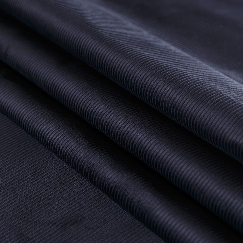 Итальянский костюмно-плательный вельвет из хлопка в черном оттенке. Очень приятный тактильно, поверхность бархатистая, рубчик средней ширины,  не тянется, не просвечивает. Подойдет для пошива костюма, платья, юбки, брюк, верхней одежды.