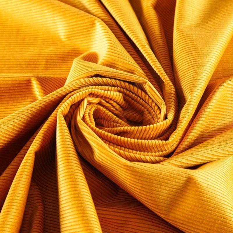 Итальянский хлопковый вельвет костюмно-плательной плотности желтого оттенка. Ткань имеет матовую фактурную поверхность в тонкий рубчик, ворс короткий, мягкий и приятный на ощупь. Хорошо драпируется и держит форму. Прекрасный вариант для пошива костюма, юбки, широких брюк, шорт, комбинезона, жакета, куртки или тренча.