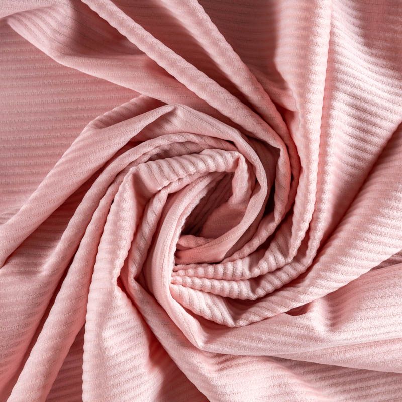 Ткань средней плотности, но удивительно нежная с матовым блеском и мягкой бархатистой поверхностью. За счет вытравки ворса лицевая сторона фактурная, в полоску. Вельвет эластичный, хорошо и мягко драпируется, не мнется. Прекрасно подходит для пошива свитшотов, платьев, юбок, спортивных костюмов, а также  для изготовления даже детской одежды.