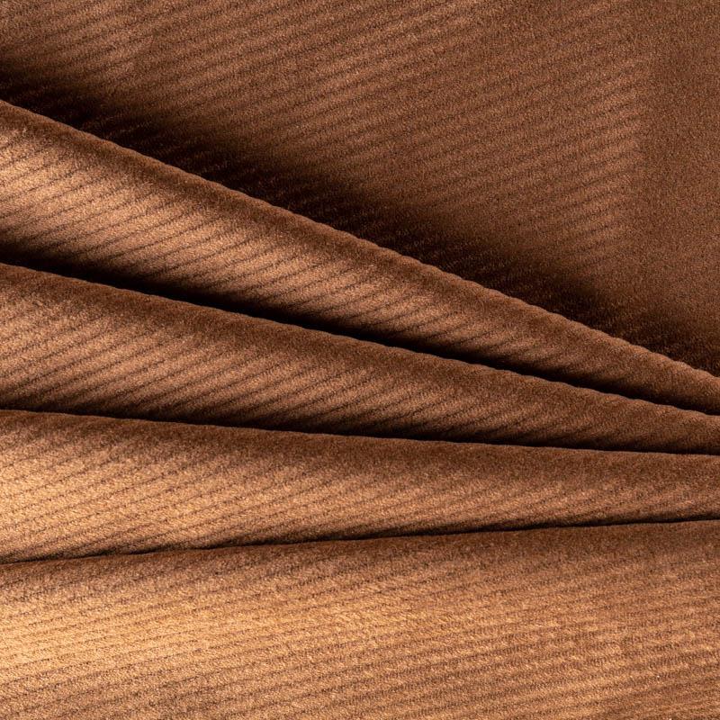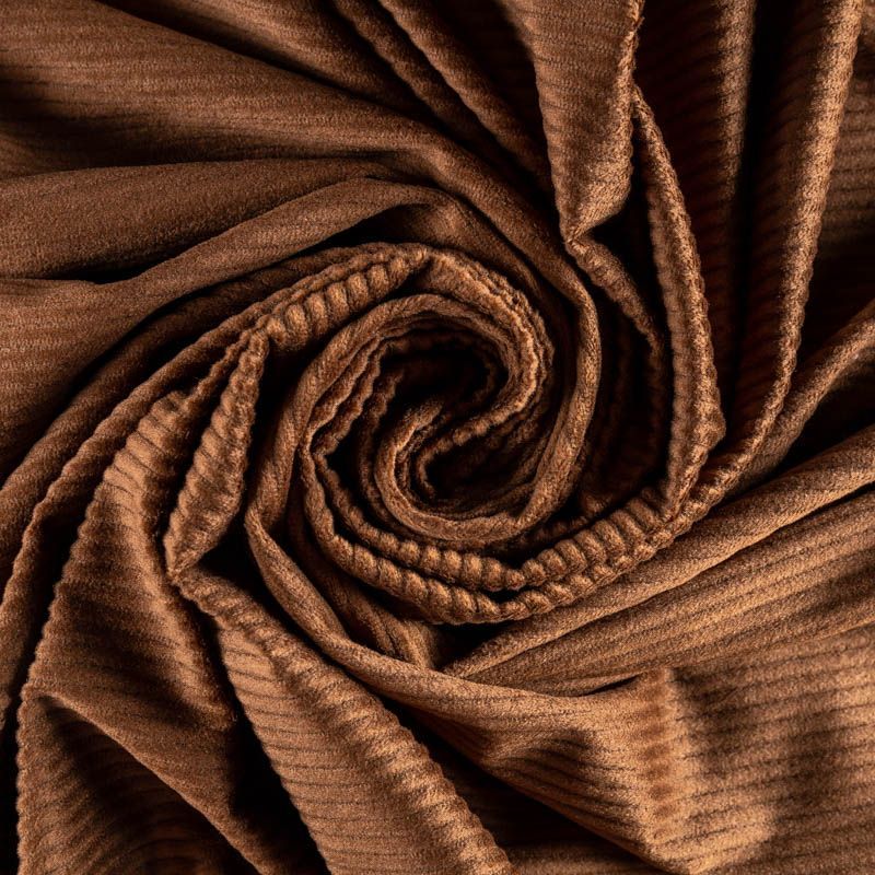 Ткань средней плотности, но удивительно нежная с матовым блеском и мягкой бархатистой поверхностью. За счет вытравки ворса лицевая сторона фактурная, в полоску. Вельвет эластичный, хорошо и мягко драпируется, не мнется. Прекрасно подходит для пошива свитшотов, платьев, юбок, спортивных костюмов, а также  для изготовления даже детской одежды.
