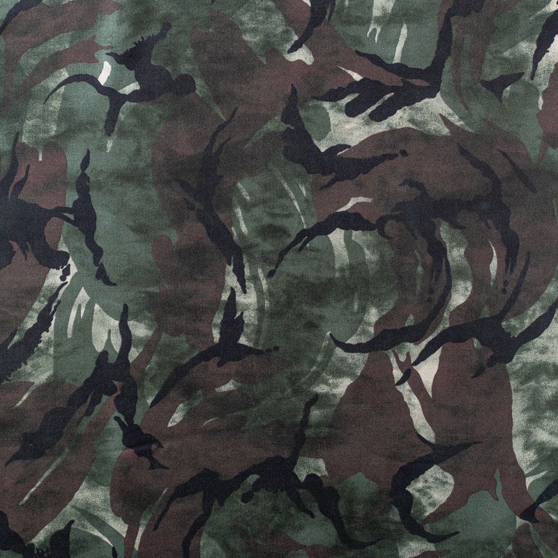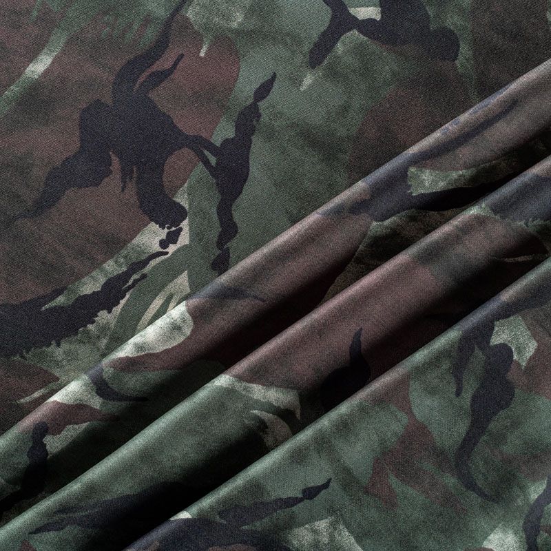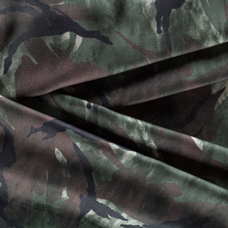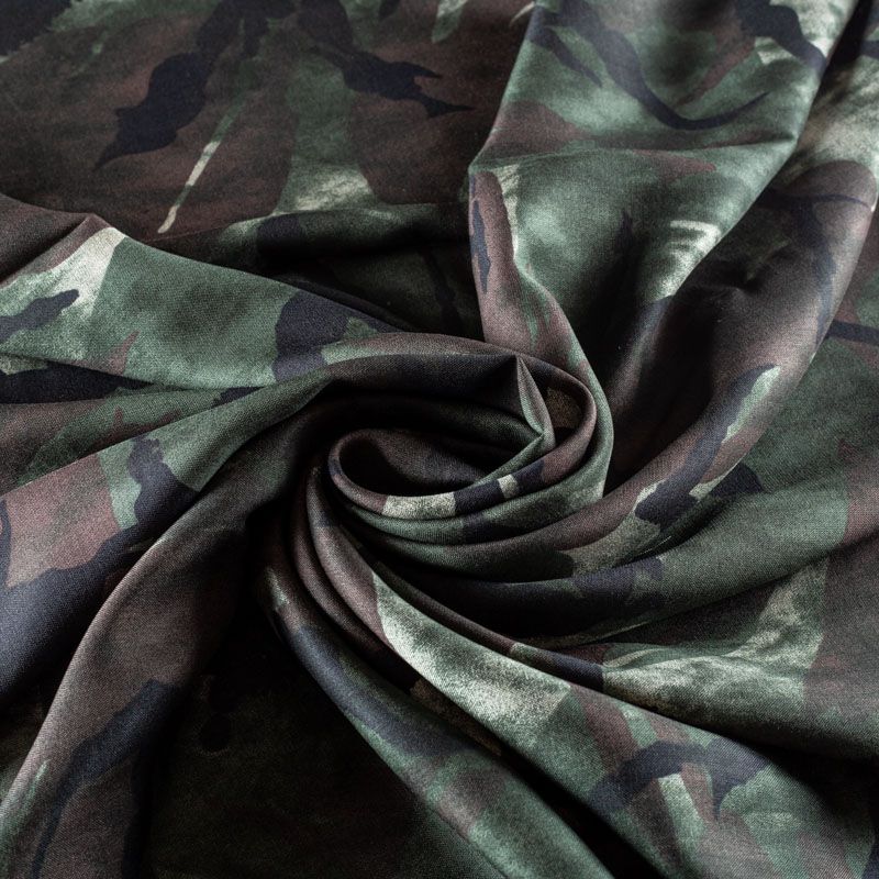 Итальянская плательно-блузочная вискоза с абстрактным принтом в зеленых, черных и коричневых оттенках, напоминающем камуфляж. Ткань очень пластичная, отлично драпируется и струится, мягкая и приятная на ощупь, не просвечивает. Прекрасно подойдет для пошива платья, топа, блузки, юбки, пижамного костюма.