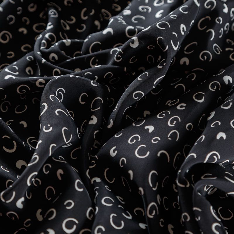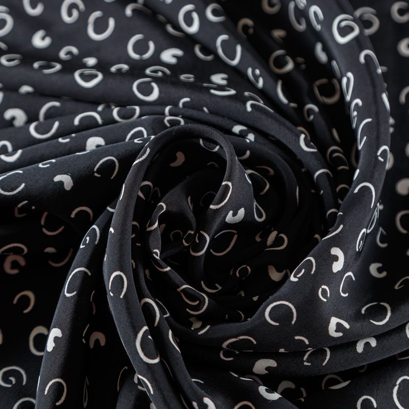Итальянская плательно-блузочная вискоза с абстрактным принтом на черном фоне. Ткань очень пластичная, отлично драпируется и струится, мягкая и приятная на ощупь, не просвечивает. Прекрасно подойдет для пошива платья, рубашки, топа, блузки, юбки, летнего костюма.