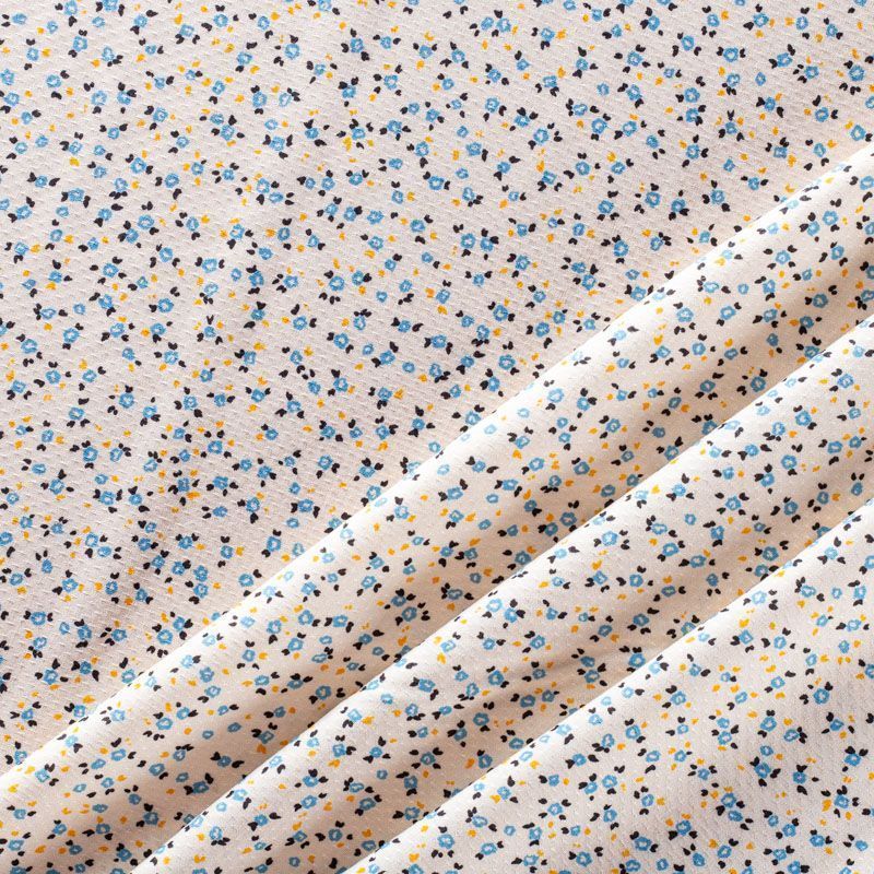 Итальянская жаккардовая вискоза сливочного оттенка с милыми стилизованными цветочками голубого цвета. Ткань тонкая, слегка просвечивает, отлично драпируется и струится, приятная на ощупь. Прекрасно подойдет для пошива платья, сарафана, топа, блузки, рубашки, юбки, пижамного костюма.