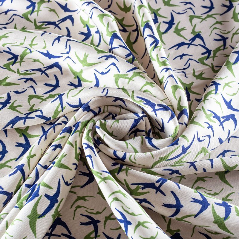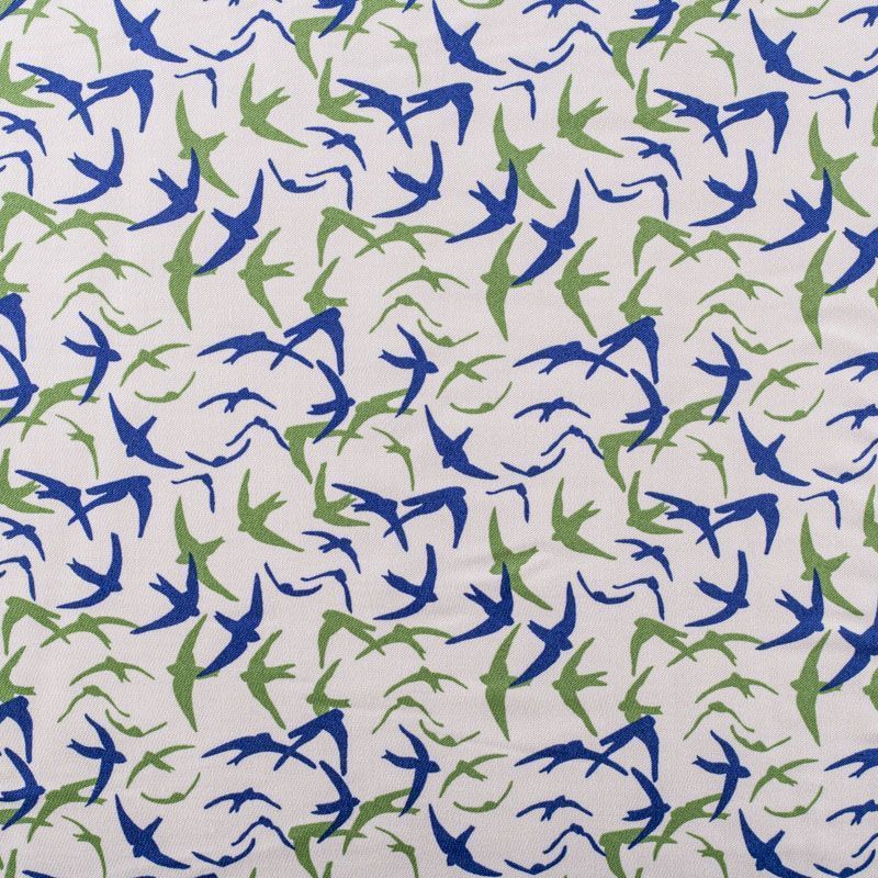 Итальянская жаккардовая вискоза молочного цвета с символами наступления весны - ласточками. Ткань тонкая, но не просвечивает, отлично драпируется и струится, приятная на ощупь. Прекрасно подойдет для пошива платья, сарафана, топа, блузки, рубашки, юбки, пижамного костюма.