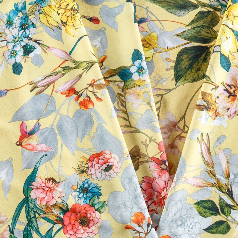 Легкая набивная ткань имеет высокую прочность, большую износоустойчивость. Материал упругий, мягкий, тянется за счет эластана в составе, хорошо драпируется, образует струящиеся складки. Идеально подойдет для пошива блуз, юбок, платьев, сарафанов.