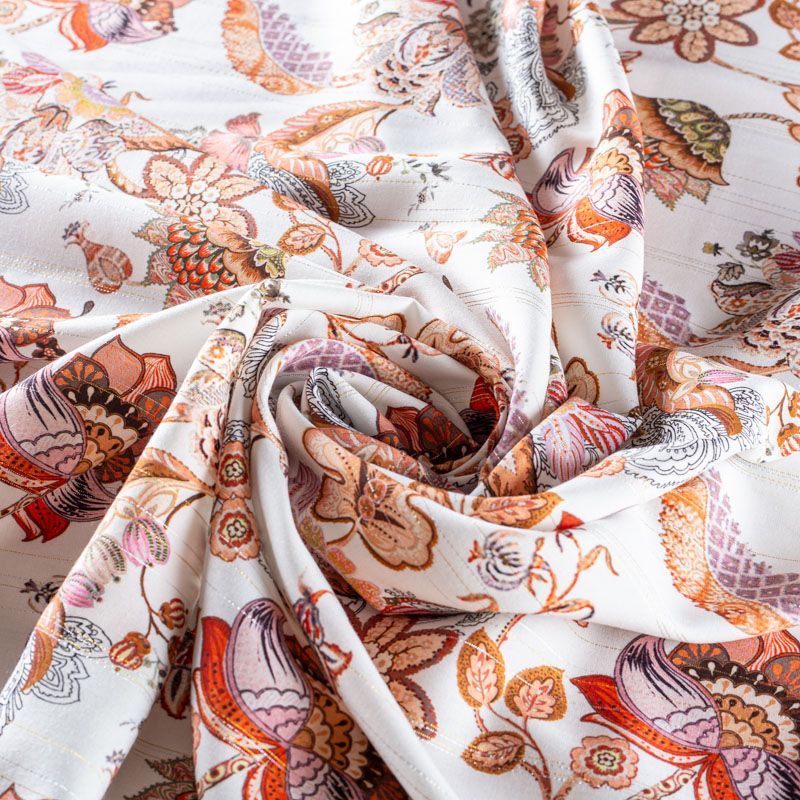 Итальянская плательно-блузочная вискоза с фантазийным цветочным принтом на молочном фоне декорирована тонкой люрексовой полоской. Ткань очень пластичная, отлично драпируется и струится, мягкая и приятная на ощупь, не просвечивает. Прекрасно подойдет для пошива платья, топа, блузки, юбки.