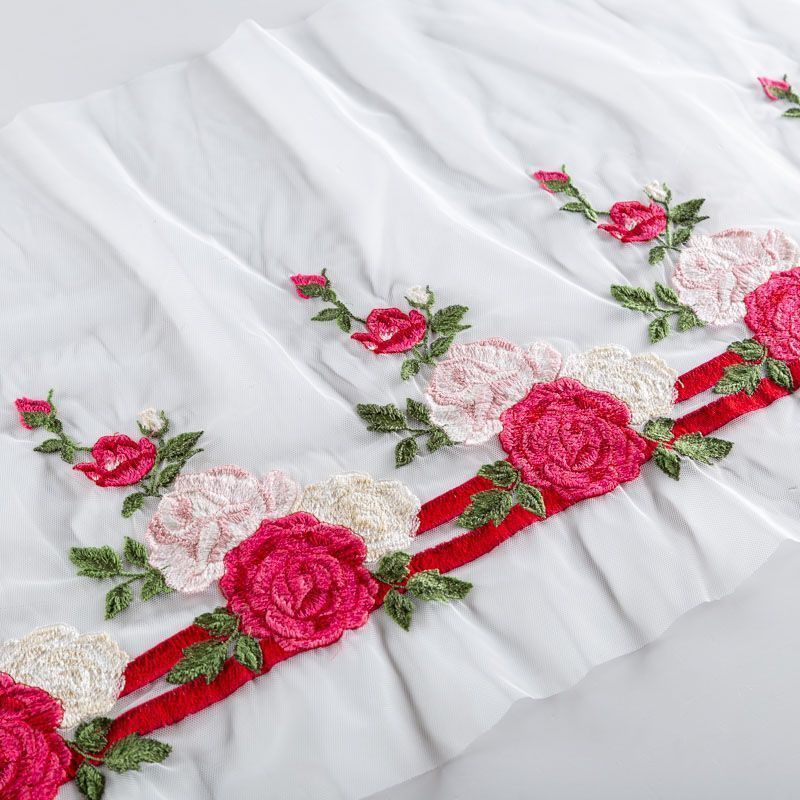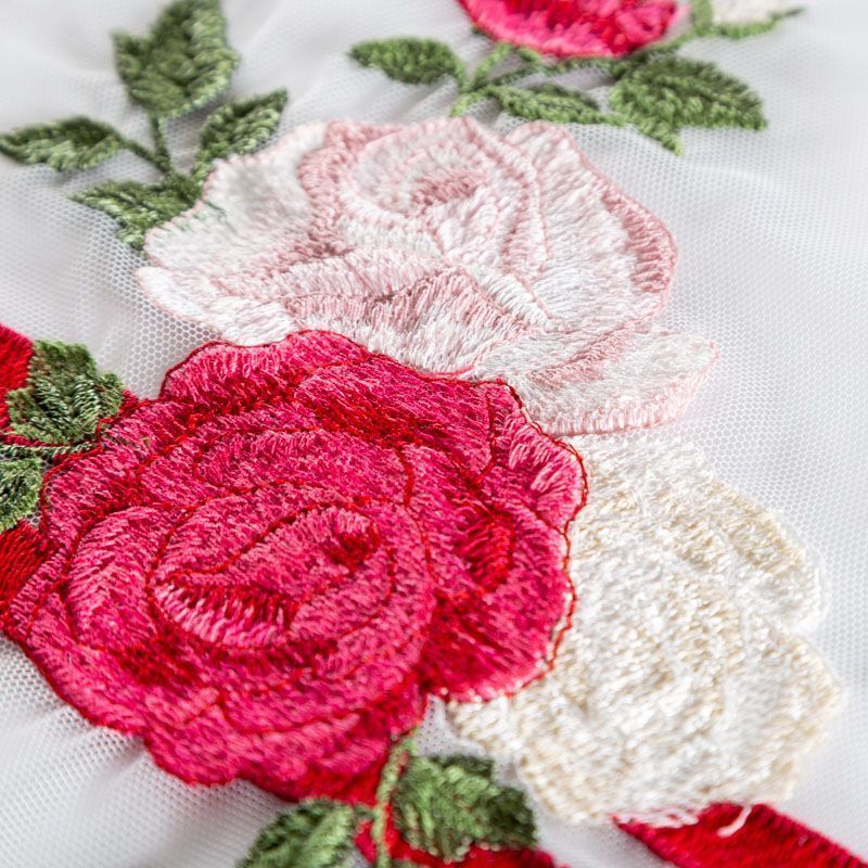 Вышивка на сетке Monnalisa высочайшего качества. Сетка молочного оттенка, мягкая, приятная на ощупь, отлично драпируется. Богатая объемная вышивка в виде красных и розовых цветов выполнена идеально. Подойдет как для самостоятельного изделия: юбка, ярусное платье, так и для декорирования любых изделий: вставка в рукав, оборка и т.д.