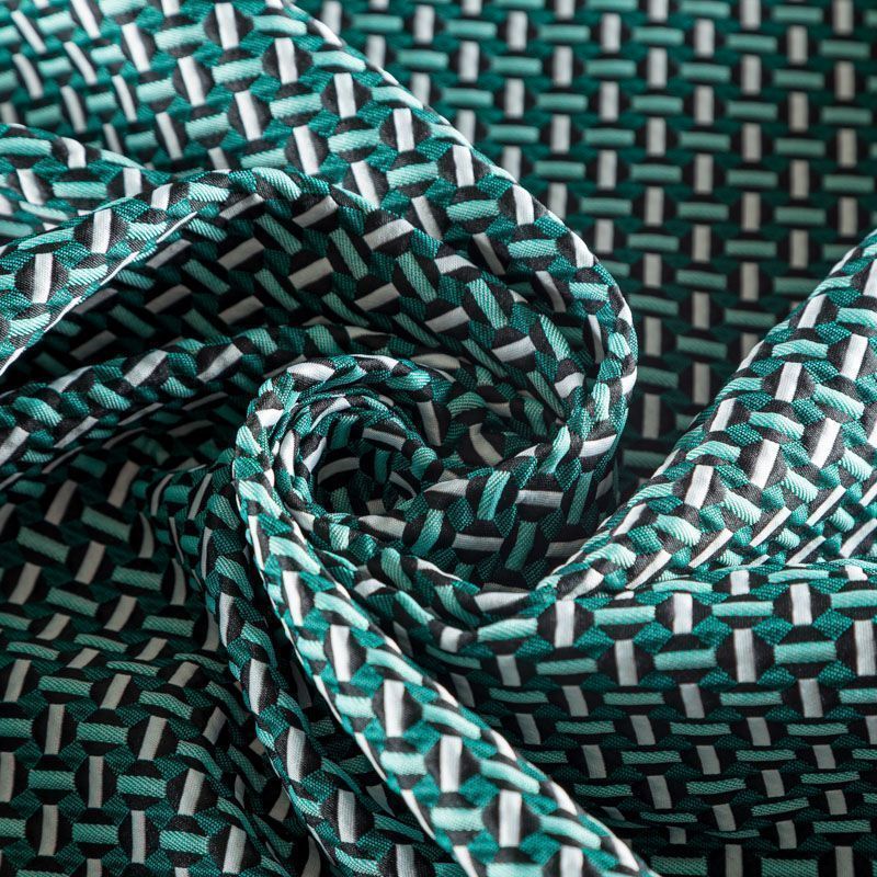 Итальянский фактурный жаккардовый купон в бело-зеленых оттенках с мелким геометрическим дизайном. По нижнему краю купона расположены контрастные полосы. Ткань отлично держит форму, тянется за счет эластана в составе, практически не мнется.